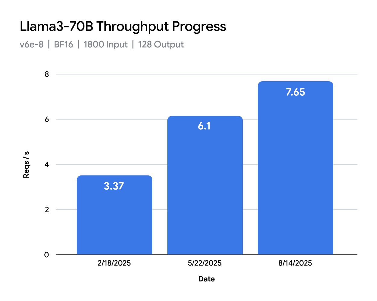Despite these obstacles, the team improved throughput performance by 3.6x for Llama 3.1-8B on v6e-1 and 2.1x for Llama 3.1-70B in v6e-8. vLLM TPU also made it to the big stage at Cloud Next. You can check out the performance evolution of these workloads here.