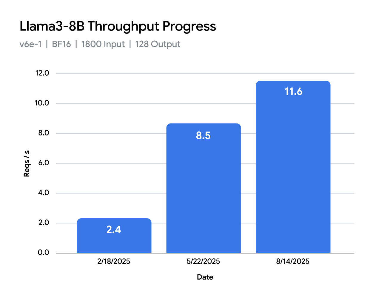 vLLM TPU has come a very long way from the prototype performance in February 2025, reaching nearly 2x-5x performance on those same workloads, while also improving model coverage and usability.