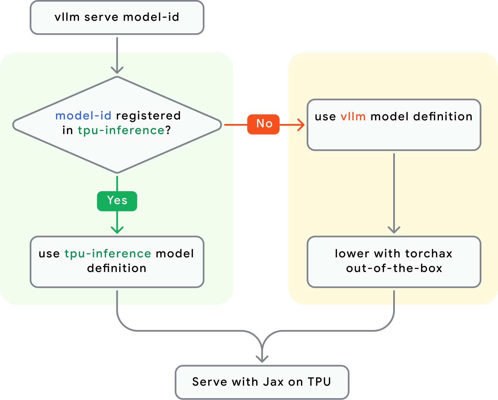 Takeaway #2: vLLM TPU will now default to running the TPU-optimized model code in tpu-inference if it exists, otherwise, it will fallback to the PyTorch model code from vLLM upstream (lowered using JAX via Torchax). For most users, this is an implementation detail.