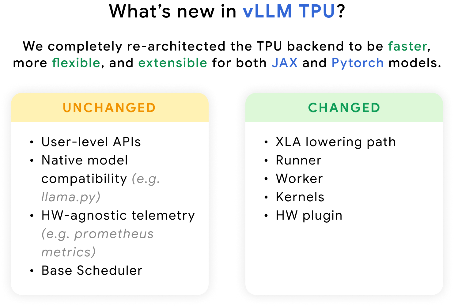 vLLM TPU is now powered by tpu-inference, an expressive and powerful new hardware plugin unifying JAX and PyTorch under a single lowering path. It is not only faster than the previous generation of vLLM TPU, but also offers broader model coverage and feature support. vLLM TPU is a framework for developers to: